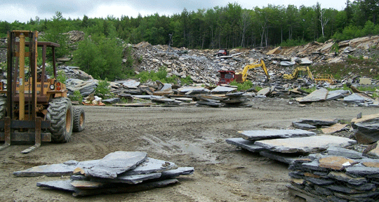 In the early years of the quarry the tools and technology were very basic. Hammers, chisels, pry bars and old truck springs sharpened at one end to split the stone free of the ledge were the main tools of the trade. As time and technology progressed air compressors, air drills, and air chisels came onto the scene as well as explosives to make things easier. Bucket loaders, excavators and bulldozers make handling the large pieces much easier, as the projects seem to want larger pieces of stone.
